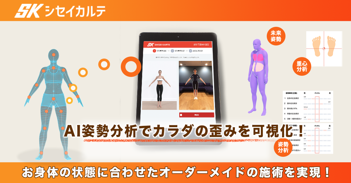 最先端の画像解析技術(AI技術)を活用し、姿勢の状態を定量化。施術・運動プログラム効果などを可視化するシステムです。身体状態のスコア化、歪み状態の定量化、柔軟性のランク分け、将来なってしまう未来姿勢の推定、歩き方の推定と指導、分析結果に合わせたケアのおすすめ、などが可能となります。この『シセイカルテ』によって、クライアントが自身の姿勢を客観的に確認でき、身体改善のモチベーションとして、また施術のポイントを把握できるようになります。